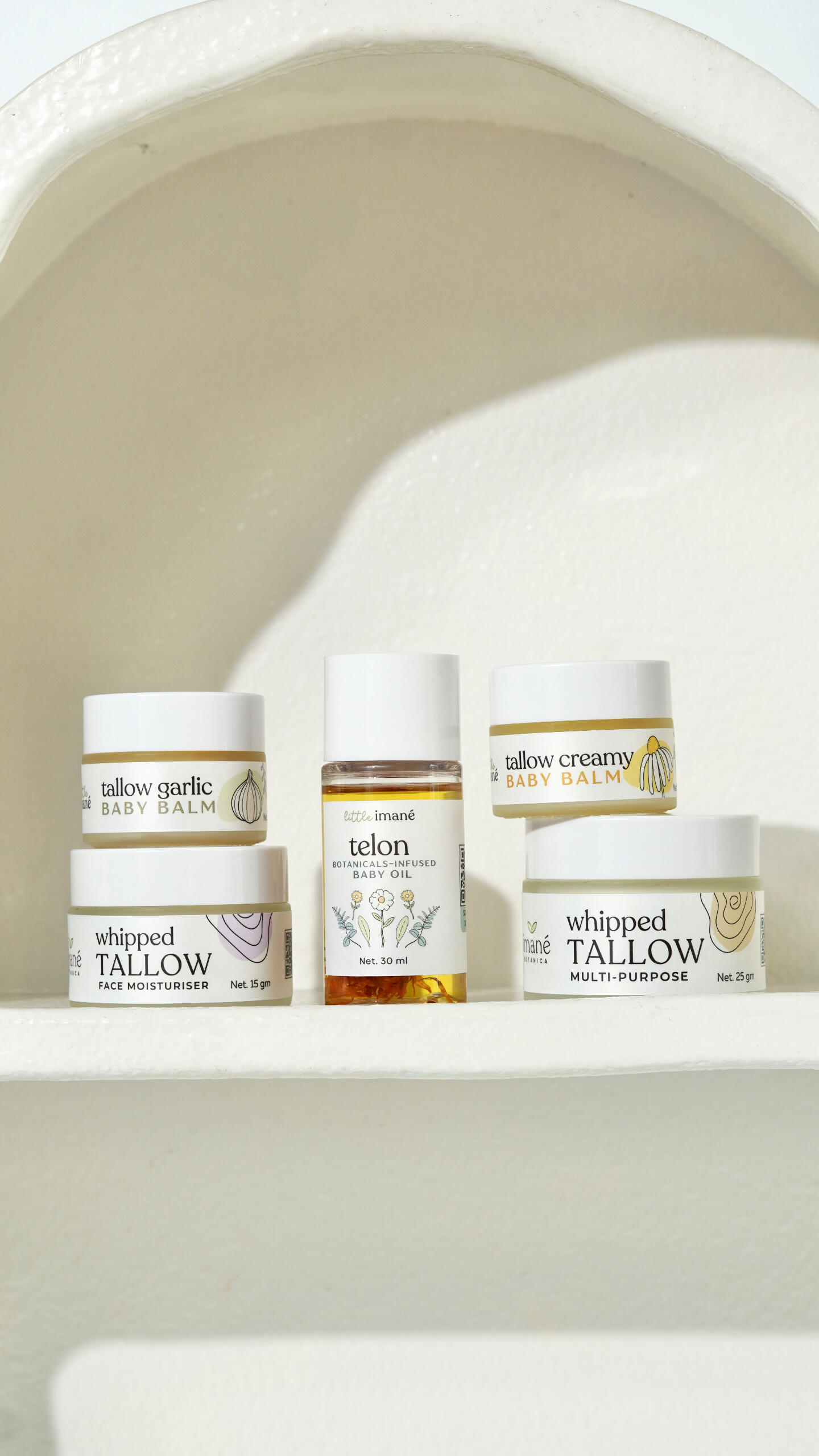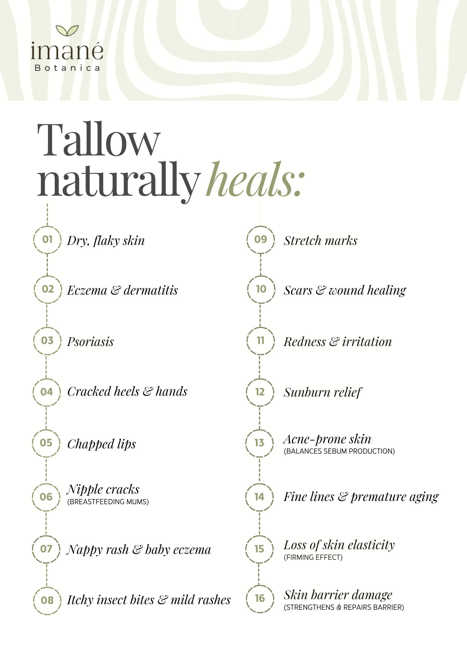 For centuries, our ancestors trusted tallow, the nutrient-rich fat rendered from beef suet, as their primary skincare staple. Before the rise of chemical creams and synthetic moisturisers, it was prized for its incredible ability to heal, nourish, and protect even the most sensitive skin.Today, in a world filled with complicated skincare routines and countless synthetic ingredients, this ancestral remedy remains a forgotten treasure. Rich in vitamins A, D, E, and K, and with a fatty acid profile almost identical to our own skin, it deeply hydrates, repairs, and restores balance without clogging pores or causing irritation.At Imané Botanica, we honour this timeless wisdom by blending pure grass-fed tallow with gentle botanicals, creating products that soothe dry patches, calm eczema, support baby’s delicate skin, and restore your natural glow.This balm makes an ultra rich body, hand, or face moisturiser. Rich in skin-supportive fatty acids like palmitic, oleic, and stearic, tallow mimics the natural lipid barrier of your skin, delivering deep, lasting moisture with no fillers or synthetic ingredients.It’s time to return to what truly works: simple, natural, and timeless. 🌿✨